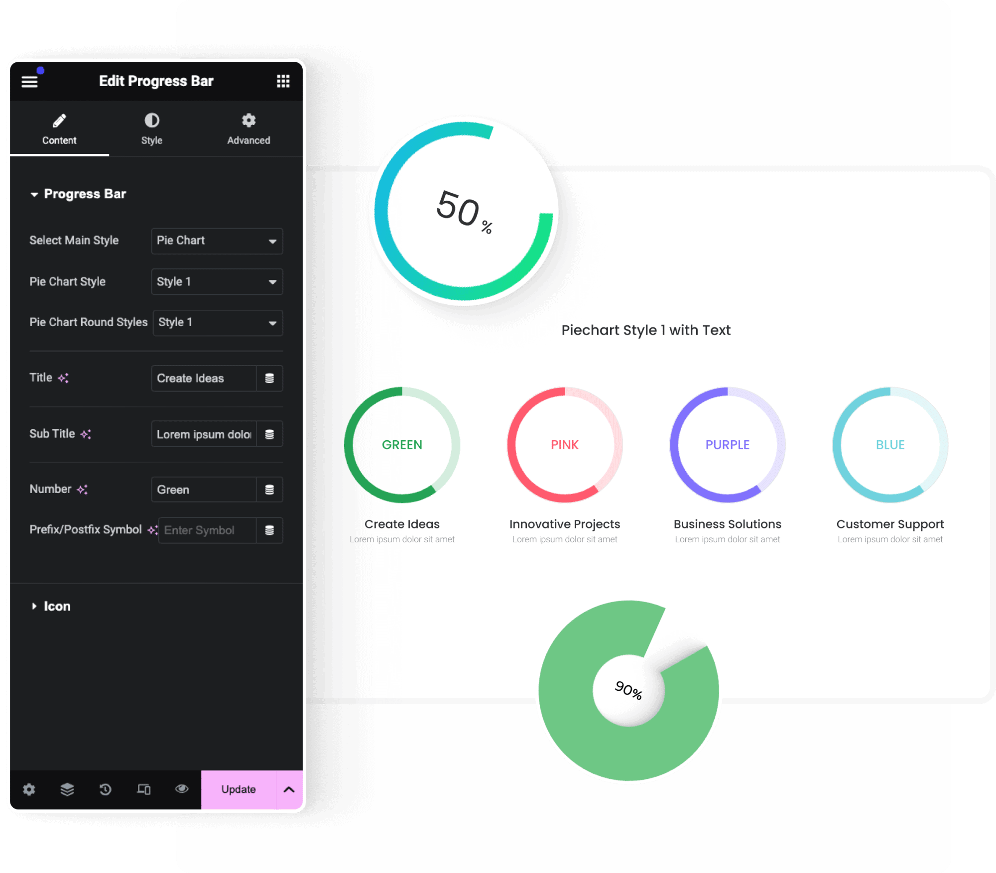 Easily create a data-driven Elementor Pie Chart to display important information. Customize styles, add text, icons, images, and Lottie animations without coding. Create custom titles, subtitles, and symbols for engaging visuals.