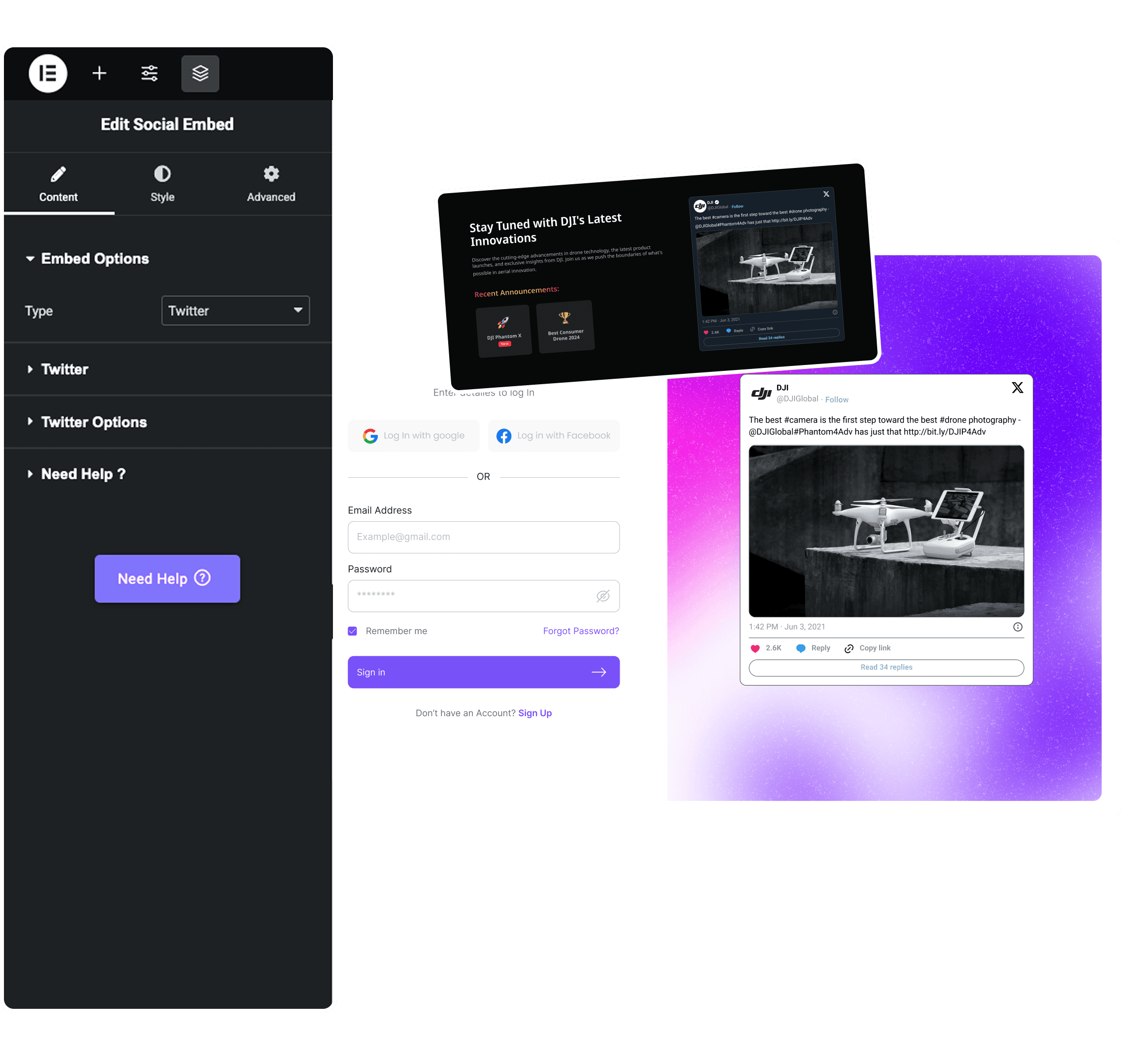 Just drag & drop the widget into the playground, fill up the social media settings & you’re ready to rock.