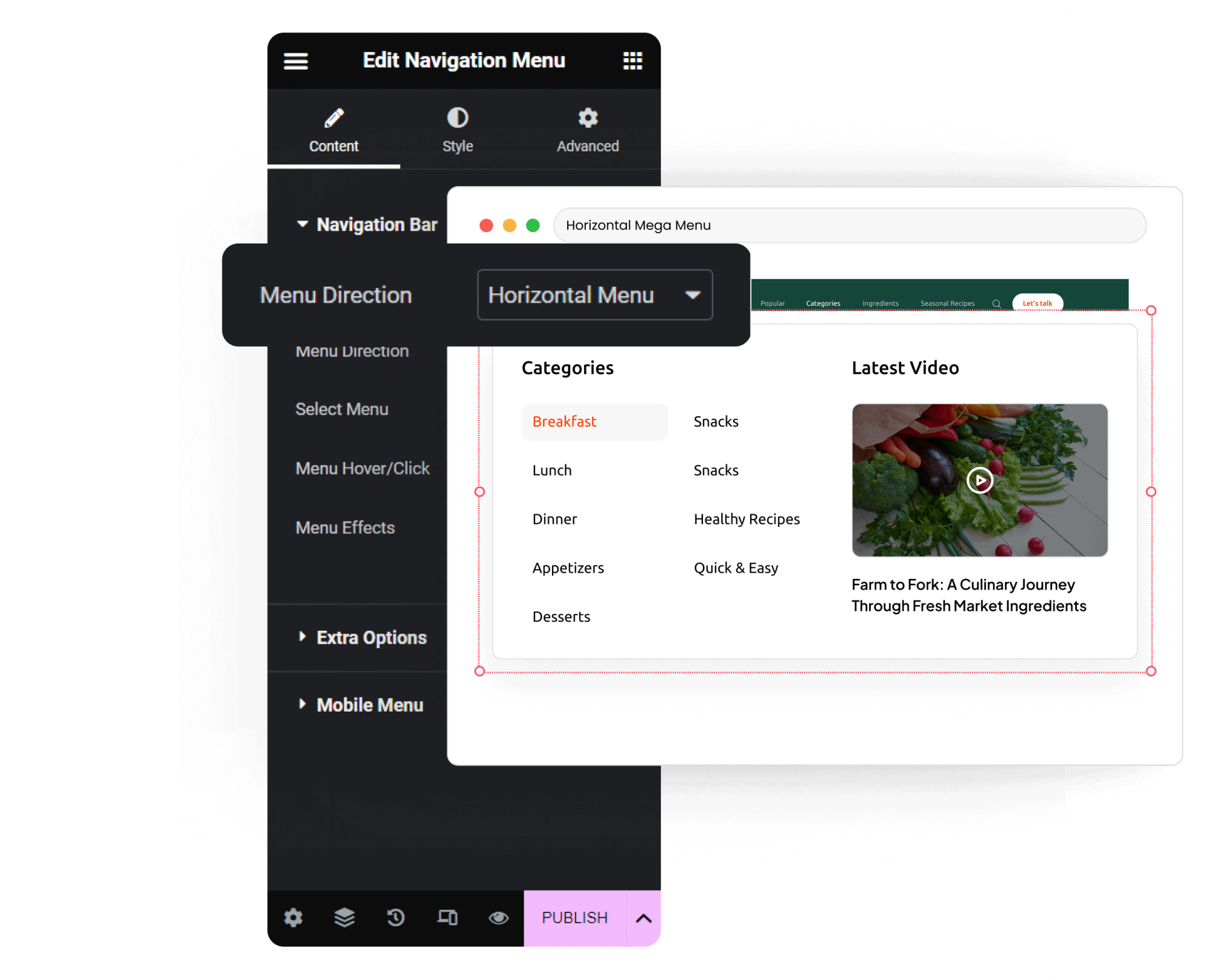 Engage visitors by adding a video player to the Mega Menu section to showcase your brand, products, or services.