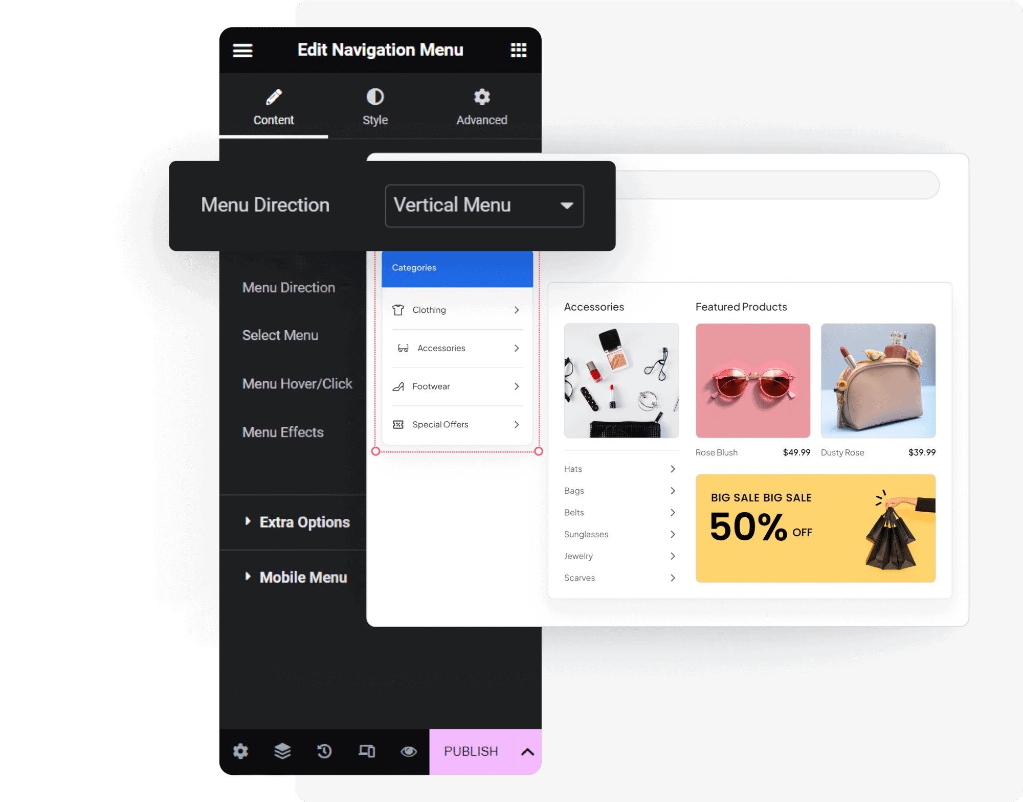 - News and MagazineBoost your e-commerce sales by using Elementor Mega Menus to showcase categories, subcategories, and products, making it easy for customers to navigate and find what they're looking for.