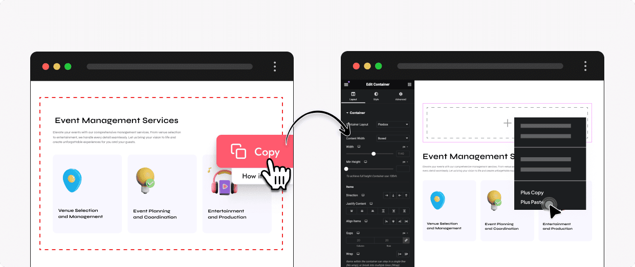 Easily copy any section from third-party domains or The Plus Addons' website live demos, with all media, text, and styles seamlessly preserved, right from your browser.
