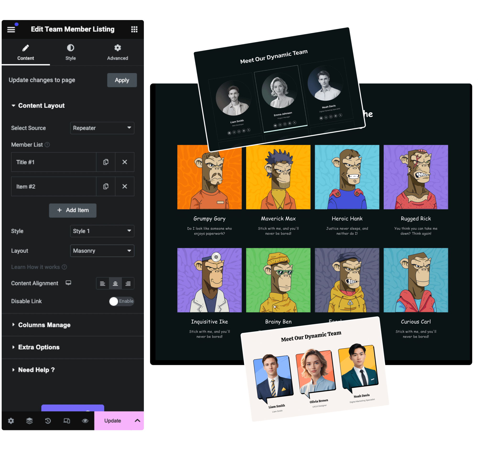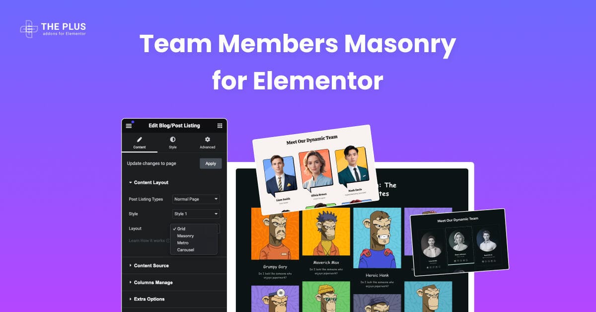 Before after customize everything team members masonry for elementor from the plus addons for elementor
