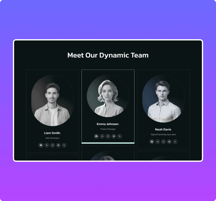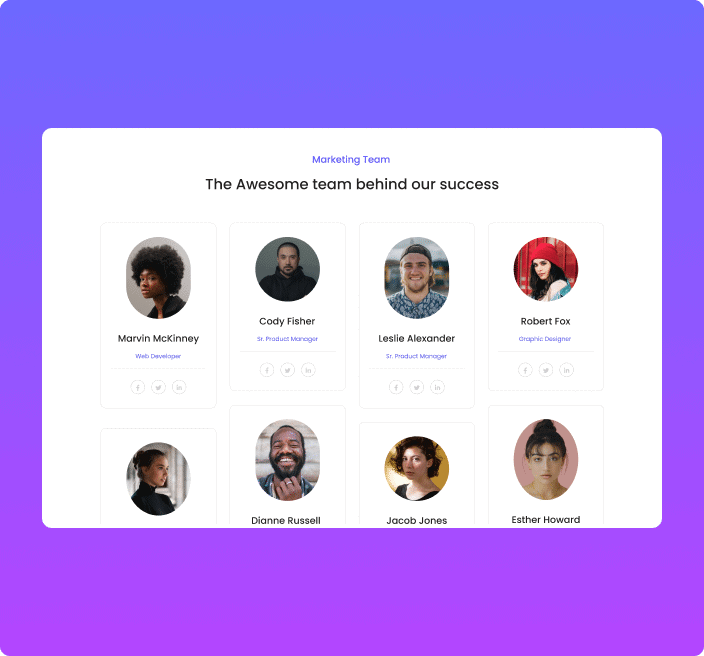 Effortlessly display your Team Members in a modern Masonry layout with the Elementor Team Members Masonry widget. Showcase your teams useful information like Image, Designation, Social links and more without any coding.