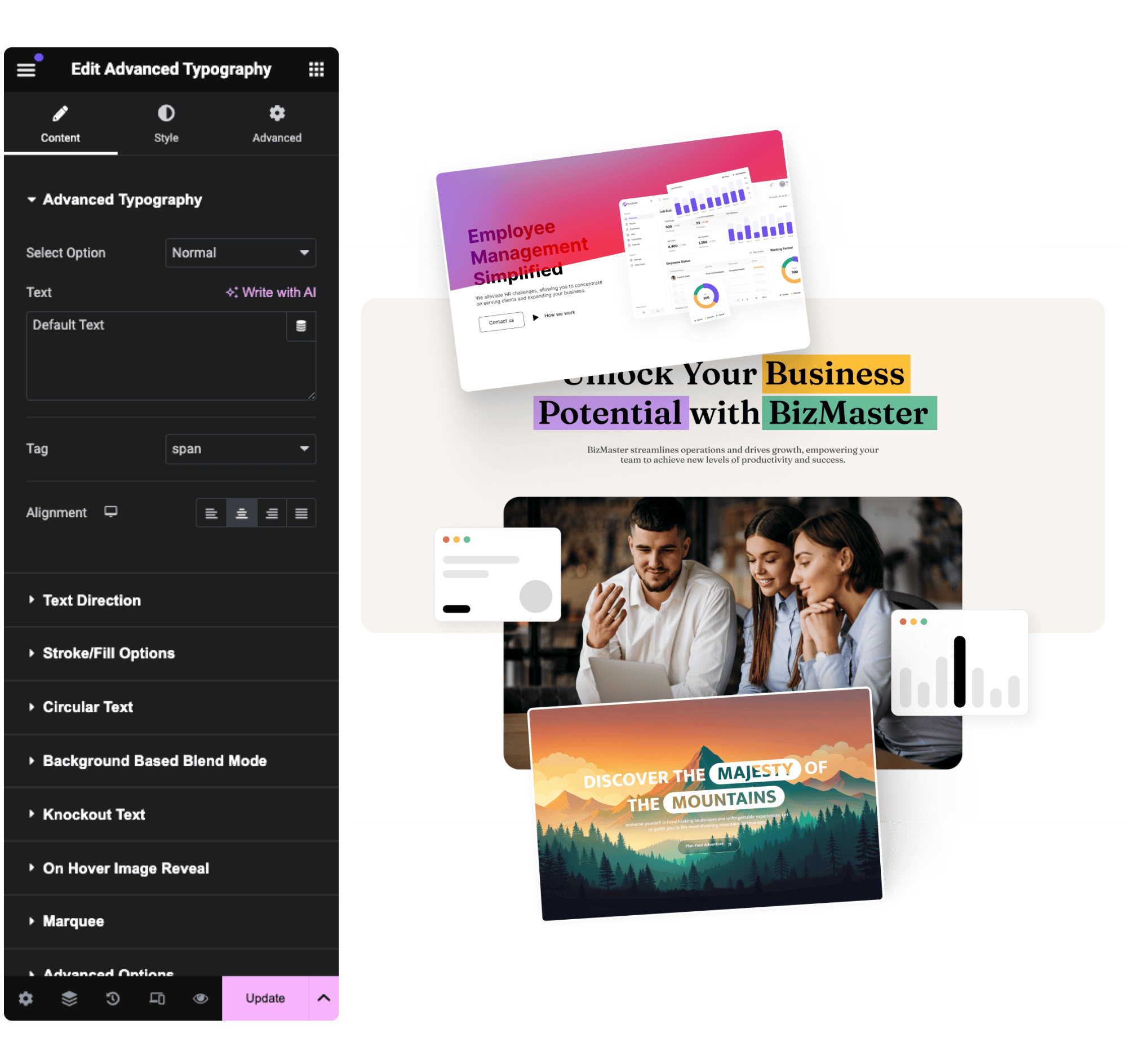 Customize your website text with Advanced Typography widget for Elementor. Unleash creative potential through Knockout Text, Magic Scroll, Text Blending, Arc and Circular Styles, 3D shadows, Stroke options, and more.