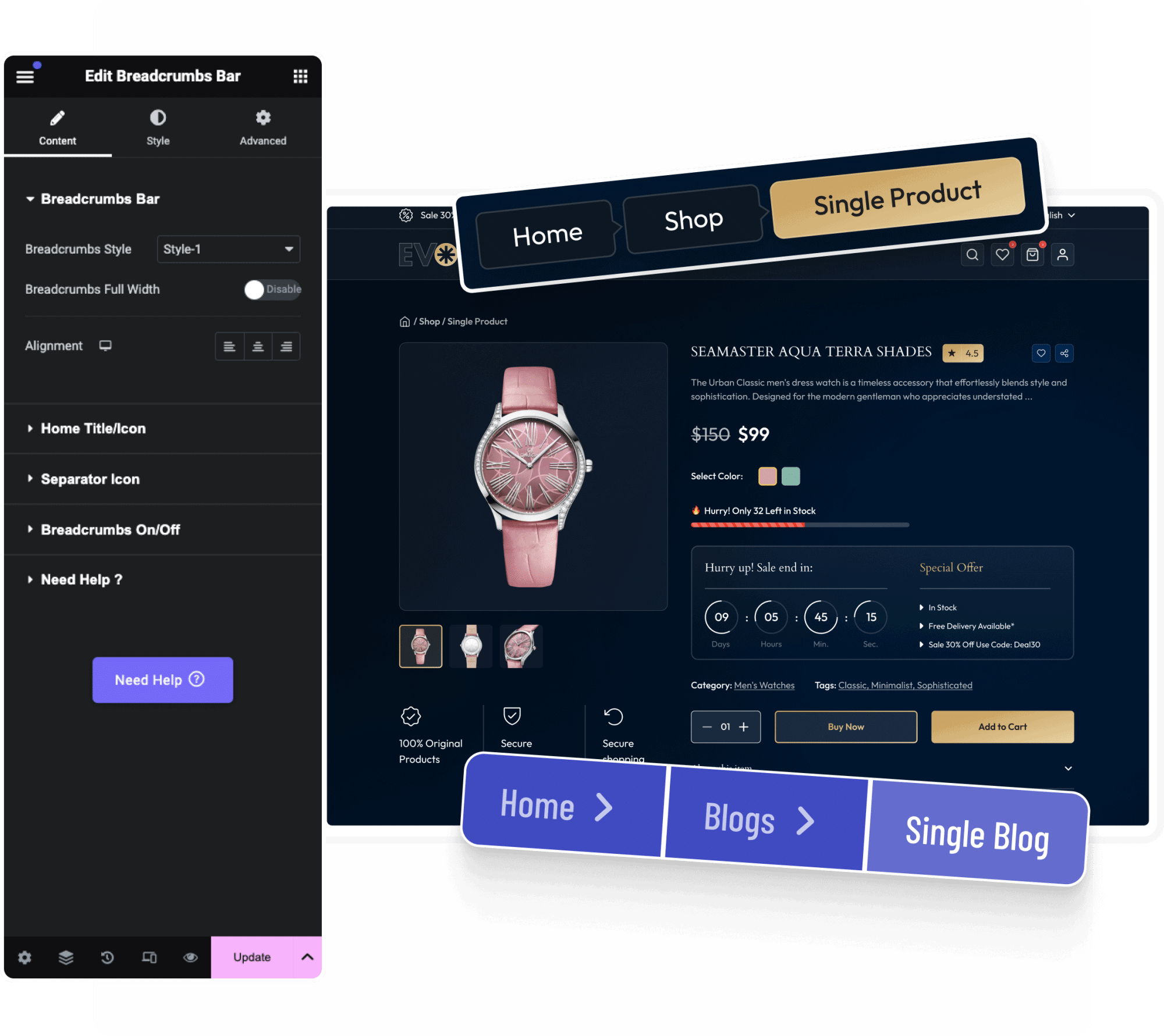 Improve your website navigation & SEO with Elementor Breadcrumbs. Choose from multiple styles, custom icons, and toggle home, parent, and current breadcrumbs on or off.